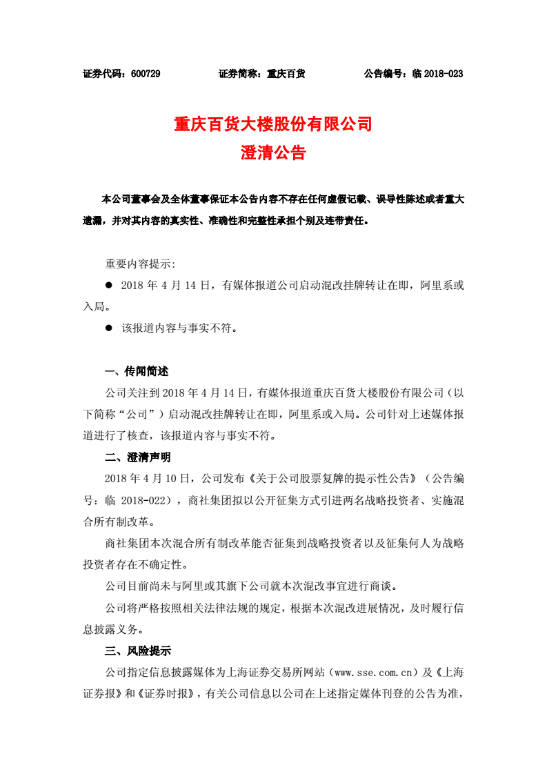 4月15日,重庆百货发布澄清公告,公司关注到2018年4月14日,有媒体报道重庆百货大楼股份有启动混改挂牌转让在即,阿里系或入局。公司针对上述媒体报道进行了核查,该报道内容与事实不符。