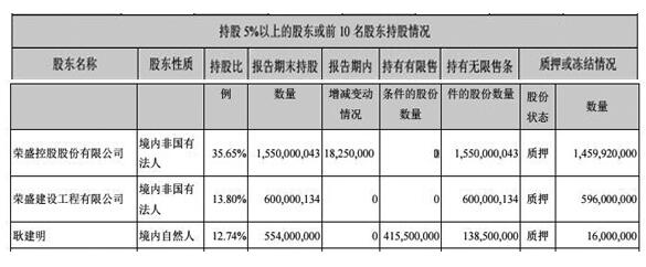 截至2017年12月31日,荣盛发展前两大股东质押凶猛,荣盛控股股份有限公司、荣盛建设工程有限公司质押股份数量分别为14.60亿股、5.96亿股,分别占所持股份的94.19%、99.33%。