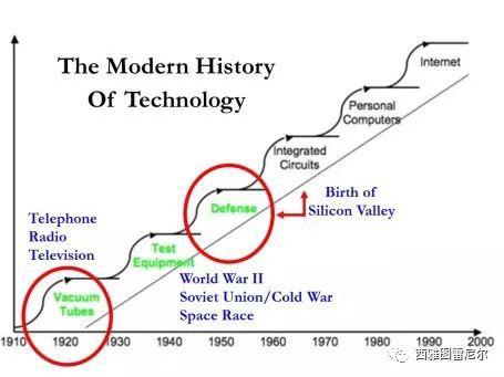 20世纪人类首先经历了无线电技术革命,发明了电报,电话等技术。因为无线电技术的广泛使用,又催生了真空电子管技术。第二次世界大战,冷战中的太空竞赛,推动了军事技术的革命。军事技术的革命,催生了集成电路产业革命。由于芯片技术的成熟,又催生了个人电脑的技术革命。当个人电脑技术革命完成之后,又催生了互联网的革命。进入二十一世纪,其实还可以加一个移动互联网的的革命。