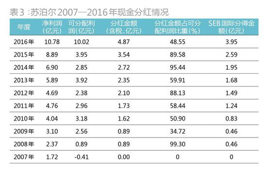 自从SEB国际2008年初完成入主后,苏泊尔就开始了持续不断的高现金分红之旅。在2008-2016年间,苏泊尔累计现金分红20.69亿元。分红现金最少的年份是2008和2009年,分别分配8880.8万元,最多的是2016年分配48645.5万元。值得注意的是,苏泊尔2008年末可供分配的利润总共只约8942.96万元,实际分配掉的8880.8万元占比高达99.3%。此外,2014和2015年分红金额占可分配利润的比重也分别高达95.44%和89.58%。不言而喻,持股比例最大的SEB国际是苏泊尔高比例现金分红的最大赢家。在苏泊尔2008-2016年累计20.69亿元现金分红中,SEB国际拿走了14.63亿元,占比为70.71%(表3)。
