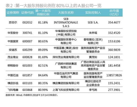 加上2015年8月A股暴跌时响应稳定市场号召而以17.5元/股从二级市场增持的1000万股,SEB国际最终合计持有苏泊尔81.17%股份,前后总共耗资85.74亿元。自从股权分置改革完成以后,A股中实际控制人如此畸高比例持股的上市公司已不多见,只剩中国石油(8.520,0.03,0.35%)等极少数涉及国家战略资源的标的还存在类似极端情况,即使像工商银行(6.030,-0.02,-0.33%)等事关国家金融命脉的超级上市公司也远比苏泊尔低(表2)。