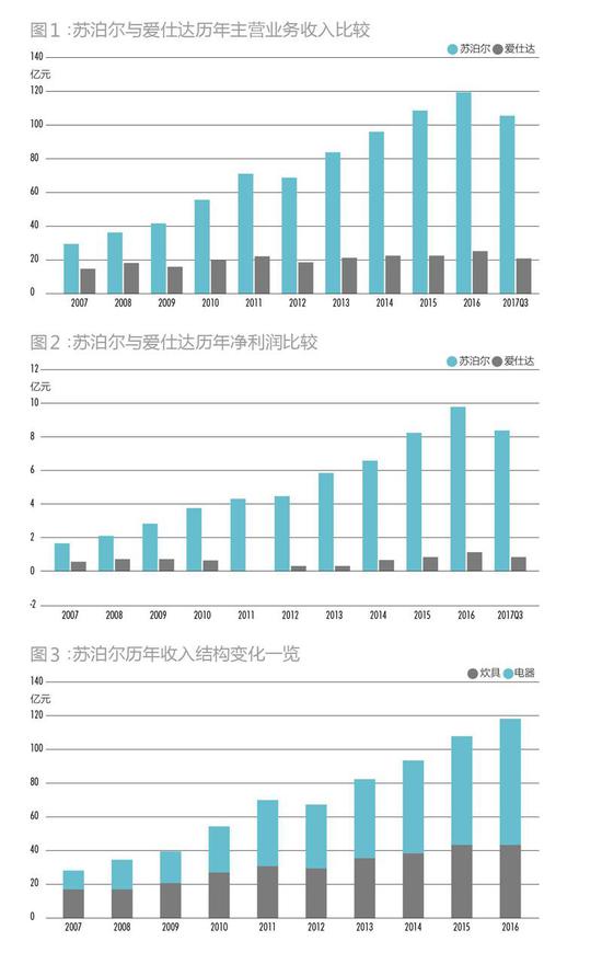 苏氏父子在苏泊尔甫一上市后便上演“胜利大逃亡”,应该算得上是明智之举。完全靠苏氏家族自身力量继续经营下去而不是嫁入SEB国际这个豪门,苏泊尔的经营估计很难实现华丽的蜕变。爱仕达(10.770,0.10,0.94%)(002403)与苏泊尔同样胎出于台州,且处在与苏泊尔不停争夺炊具行业老大的优势地位上,但完全依靠自身发展的爱仕达2017年的净利润只约苏泊尔的12%(图1、2)。